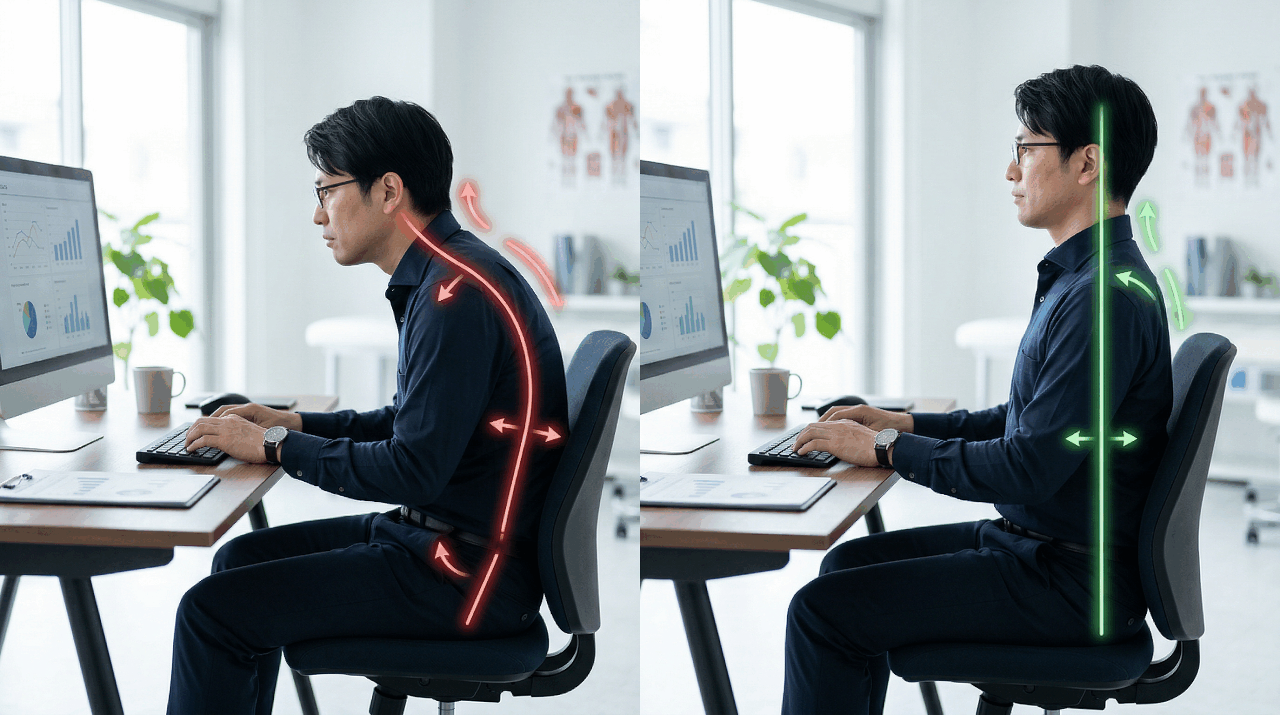 たとえば、デスクワークによる長時間のパソコン作業や、スマートフォンを見る姿勢が続くことで、猫背になりやすくなります。すると骨盤の位置も乱れ、背中や首、腕まわりの筋肉に余計な負担がかかってしまいます。
